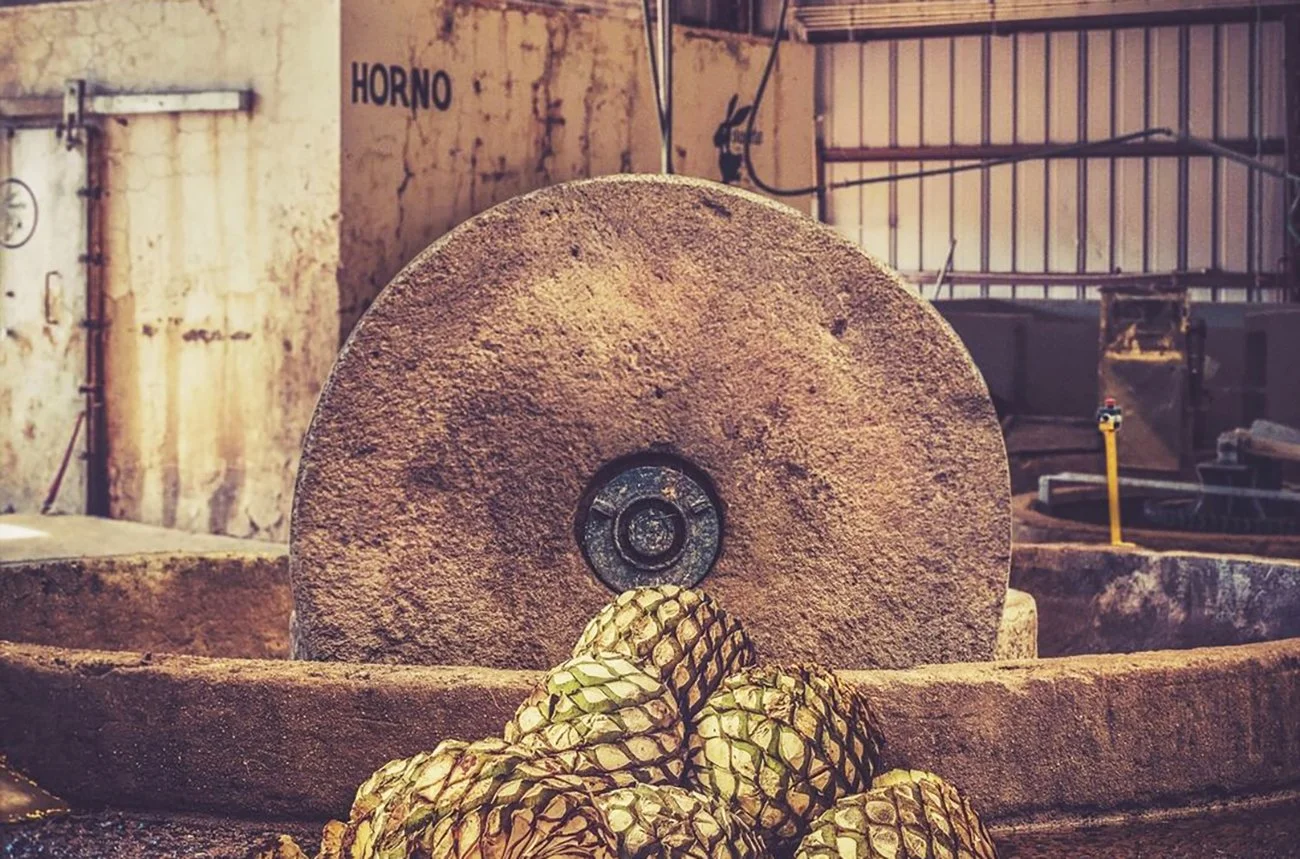 Cooked Blue Agaves are tenderly ground beneath the heavy stone of a traditional tahona wheel—a timeless ritual that pays homage to the soul of the plant, releasing its rich, sweet essence with every slow, deliberate turn.